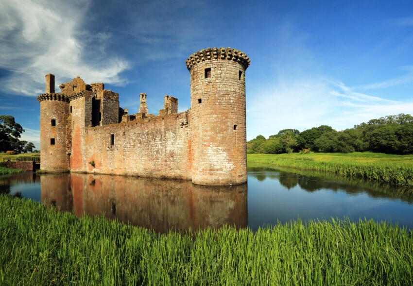 A 13 km de Dumfries se encuentra el Castillo de Caerlaverock, un magnífico castillo en ruinas digno de postal: rodeado por un amplio foso, construido en arenisca roja que resplandece bajo la cálida luz del atardecer, tiene una extraña forma triangular y a pesar del deterioro ha conservado intacta la puerta de entrada y las dos poderosas torres.