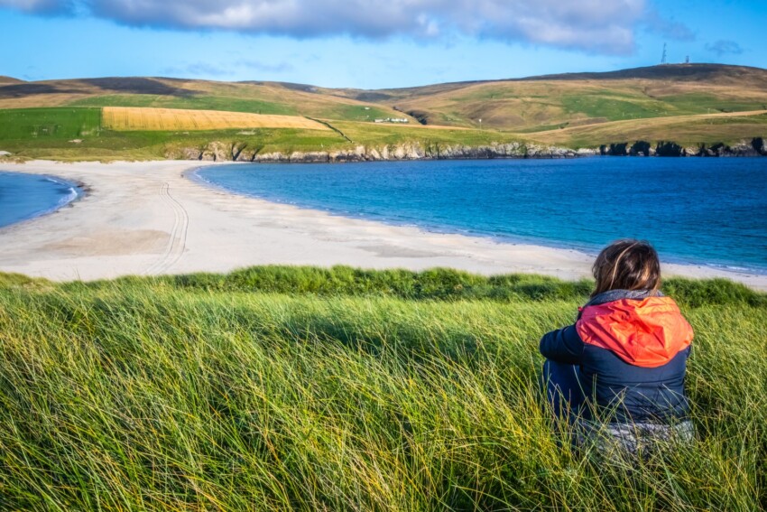 No se sorprenda si pasa horas y horas en coche sin encontrar a nadie: admirando este paisaje deshabitado y cubierto de rocas llegará a Sandness Hill, un fértil oasis de prados verdes, acantilados y hermosas playas.