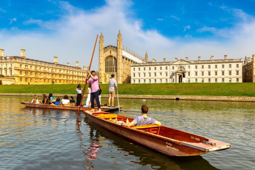 Una experiencia imprescindible en Cambridge es el punting, la tradicional excursión en barca por el río Cam. Estas embarcaciones de fondo plano se impulsan con una larga pértiga, ofreciendo una perspectiva única de los «Backs», los jardines posteriores de los colegios que se asoman al río.