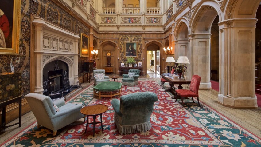 El corazón pulsante de Highclere Castle es sin duda el salón de representación, una sala majestuosa que se eleva más de 15 metros de altura y que representa el más perfecto ejemplo de arquitectura neogótica victoriana dentro de la residencia. Esta es probablemente la estancia más icónica de Downton Abbey: aquí Lord Grantham recibía a los huéspedes ilustres, aquí se desarrollaban las escenas de bailes y recepciones formales, aquí la familia se reunía en los momentos más dramáticos de la serie. Las paredes están revestidas con preciosos paneles de cuero español del siglo XVII, mientras que las galerías que dominan la sala crean ese efecto escenográfico que ha hecho que esta estancia sea inmortal en las escenas de la serie.