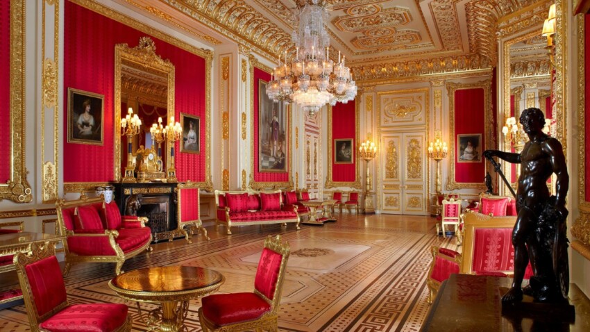 Dentro de los Apartamentos de Estado, la majestuosa Grand Reception Room atrae inmediatamente la atención de los visitantes con sus techos ricamente dorados y sus imponentes lámparas de cristal. Las paredes, adornadas con valiosos tapices de la colección real y muebles dorados al estilo rococó, cuentan historias de esplendor y celebraciones reales.