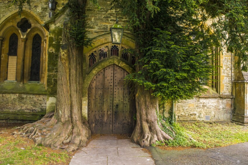 La St Edward’s Church es famosa por sus «puertas de los hobbits«, flanqueadas por dos antiguos tejos, que parecen salidas de un cuento del Señor de los Anillos.