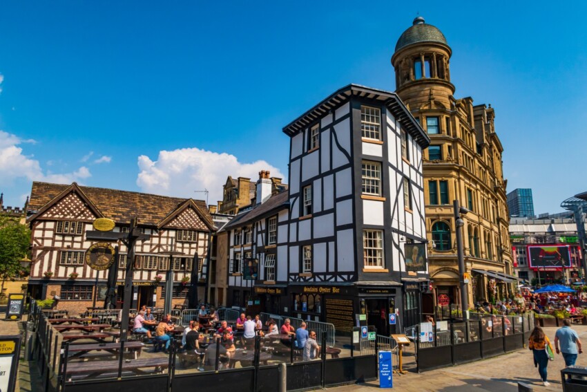La joya de la plaza es el Old Wellington Inn, construido en 1552 y considerado el pub más antiguo de Mánchester. El edificio de entramado de madera, con su característica estructura de madera negra y paredes blancas, es un ejemplo perfecto de arquitectura Tudor. Junto a él se encuentra el Sinclair’s Oyster Bar, también un edificio histórico del siglo XV que mantiene intacto su encanto medieval. La historia de estos edificios es aún más extraordinaria considerando que fueron trasladados, piedra a piedra, desde su ubicación original en 1974 para preservarlos durante la revitalización del centro de la ciudad.