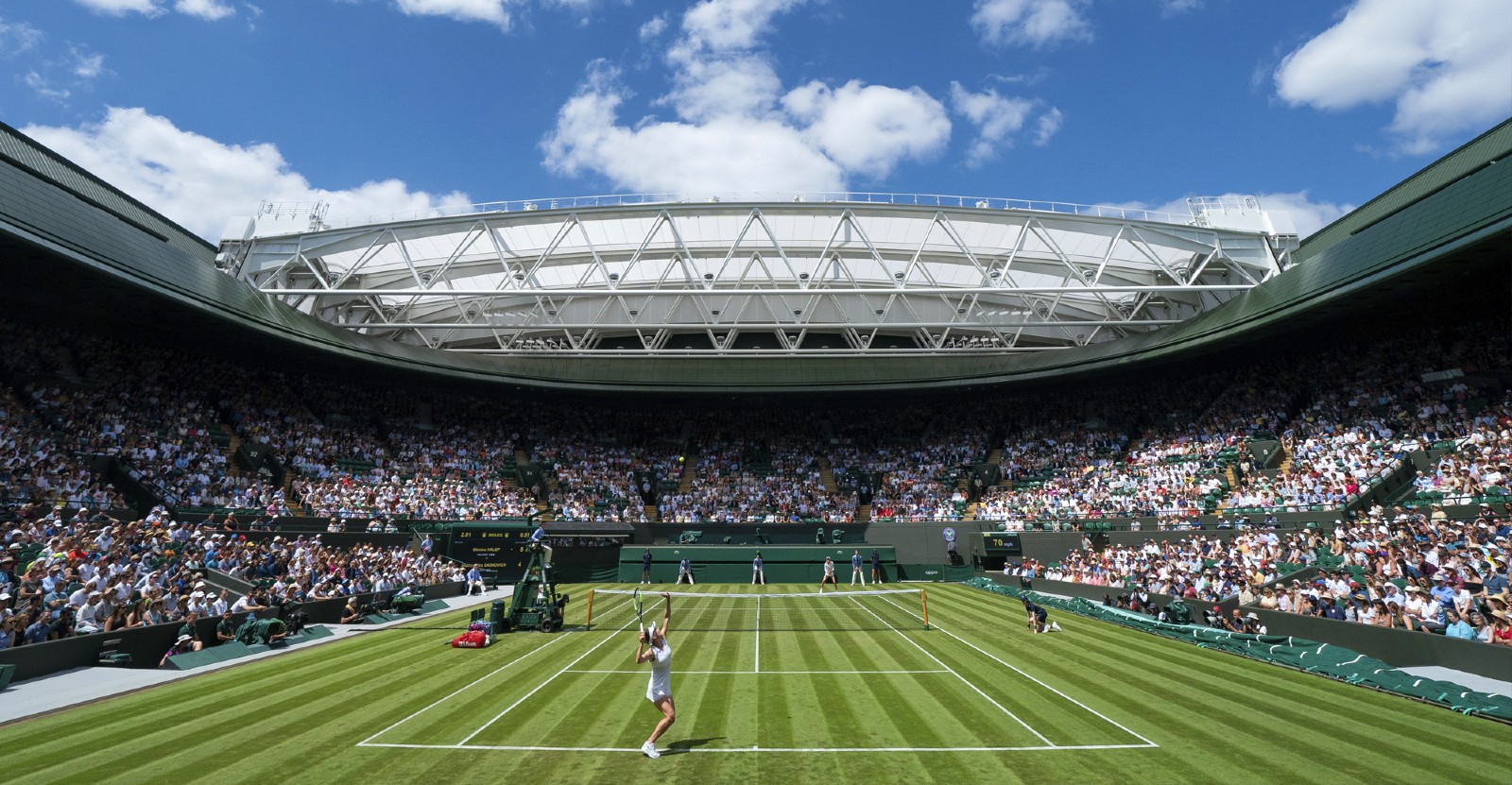 El Centre Court es el corazón palpitante de Wimbledon y uno de los lugares más sagrados del tenis mundial. Inaugurado en 1922 cuando el torneo se trasladó a su sede actual, este estadio ha albergado algunos de los momentos más memorables en la historia de este deporte. La característica más distintiva es el techo retráctil instalado en 2009, que revolucionó el torneo permitiendo el juego incluso en caso de lluvia, tradicionalmente un elemento disruptivo para el evento.