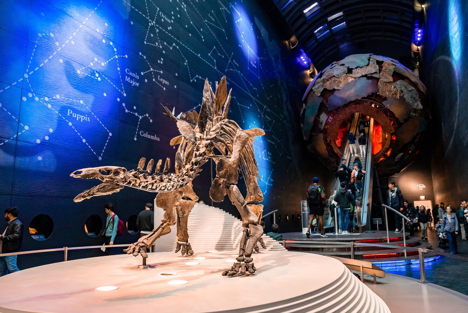 En el centro del atrio, no podrá dejar de notar el enorme globo metálico llamado «Stegosaurus», una instalación artística que representa la Tierra y sus procesos geológicos. Este globo está compuesto por 3.300 placas de metal e iluminado desde el interior, creando un efecto visual espectacular.
